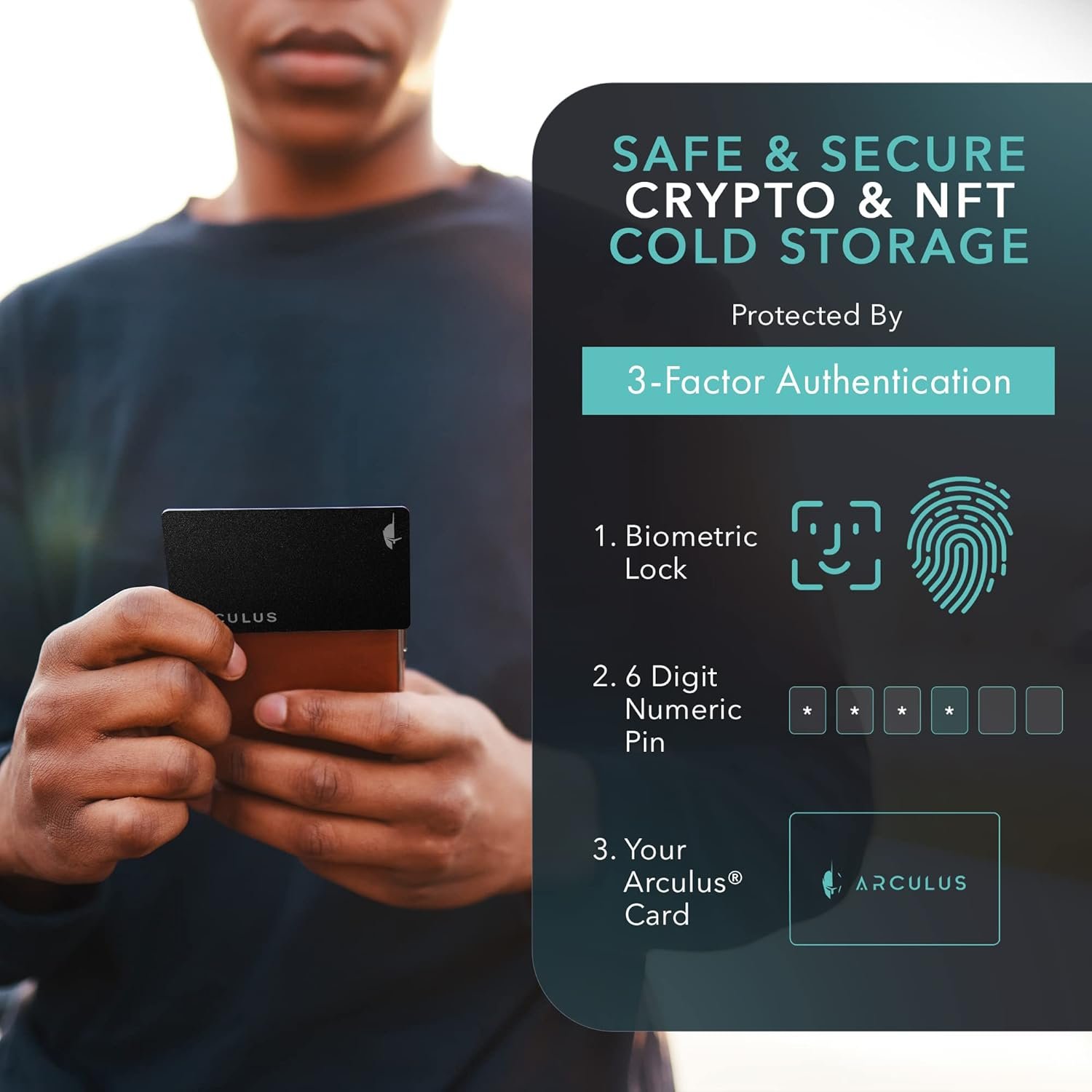 Superior Security – Elevate the cold storage safety of your digital assets with Arculus's innovative 3-factor authentication system: biometric lock, 6-digit PIN, and the Arculus metal card with private key encryption for multiple layers of security.