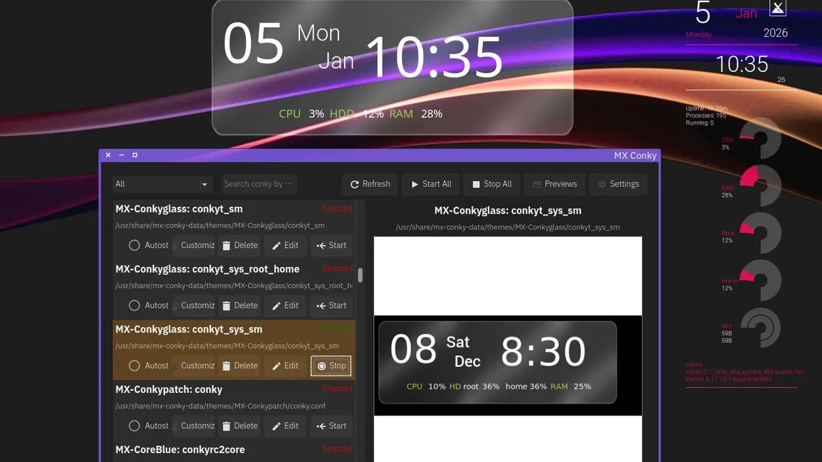 If you're into Conky (a tool that displays various types of information on the desktop), then you'll dig Extrox. Within the desktop menu, you'll find MX Conky, a tool that makes adding and configuring Conky a breeze.