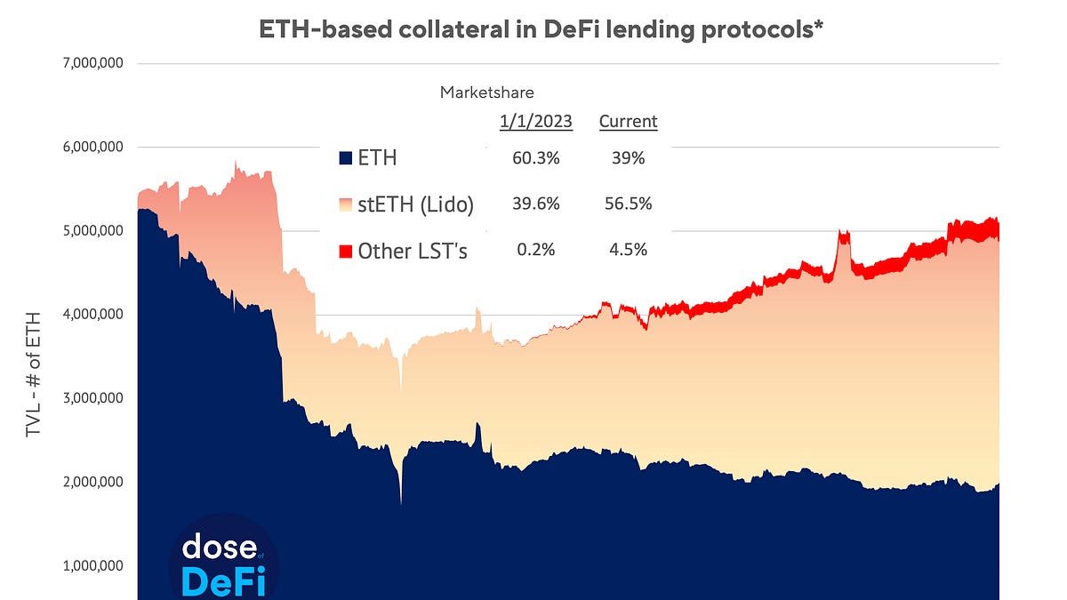 DeFi lending protocols did not unveil new protocol designs like their DEX brethren. Instead, they were focused on diversifying diversifying its collateral base. The most significant change of the year was the shift from ETH as the primary source of collateral to LSTs, specifically Lido’s stETH, which now accounts for a staggering 56% of collateral in major DeFi lending platforms. This explains Lido’s rise and reinforces its dominance, as its liquidity in DeFi simply makes it more useful than other LST’s.